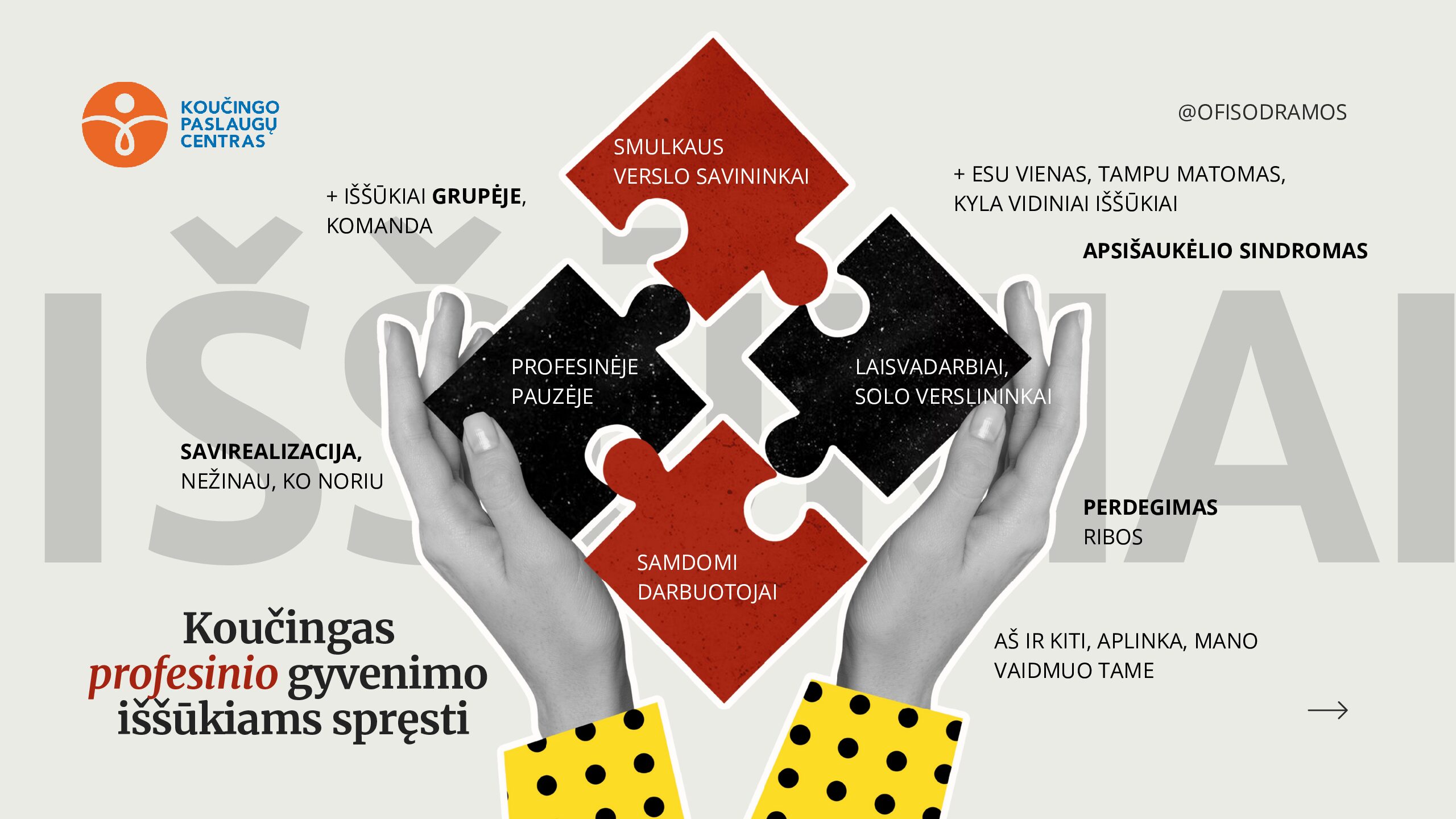 Koučingas profesinio gyvenimo iššūkiams spręsti – paskaita būsimiems koučingo specialistams besidomintiems profesinio gyvenimo temomis. Paskaitoje nagrinėjamos su darbu susijusios temos ir užklausos: perdegimas, toksinė aplinka, ribos, apsišaukėlio sindromas, produktyvumas, planavimas, atidėliojimas, sprendimų priėmimas, savirealizacija. Paskaitoje derinama teorija, ekspertų žinios, praktiniai klausimai ir asmeninės patirtys.