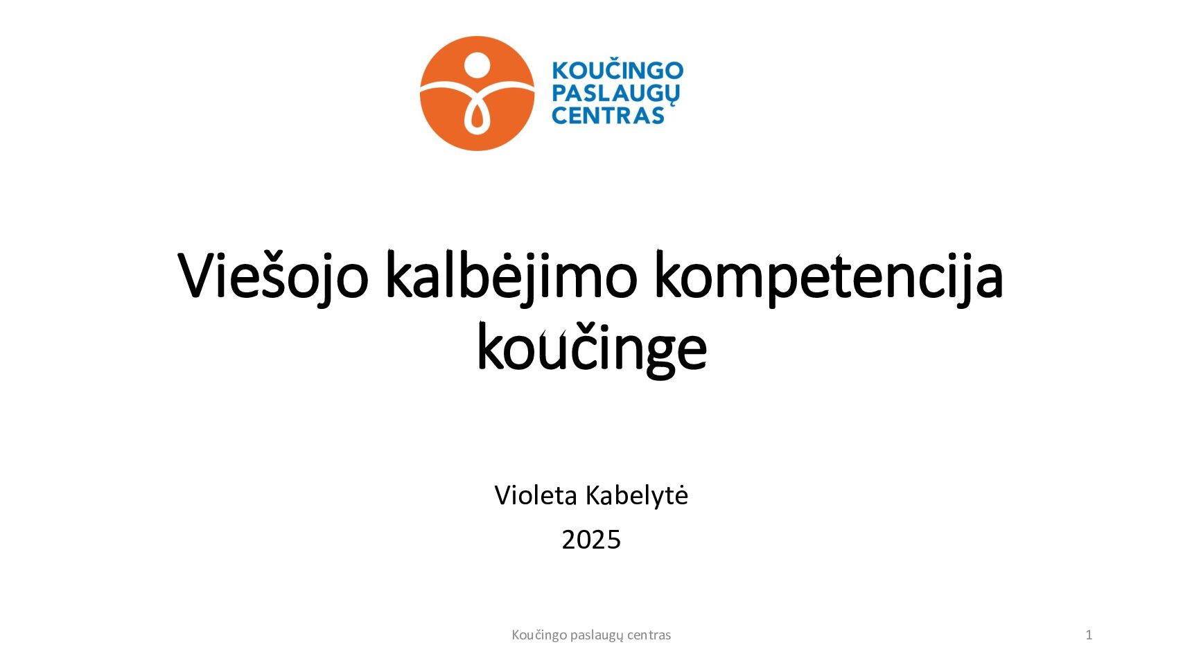 Viešo kalbėjimo kompetencija koučinge. Koučingo veikloje viešasis kalbėjimas yra daugiau nei žodžiai – tai erdvė, kurioje gimsta ryšys, aiškumas ir pokytis. Šioje paskaitoje nagrinėjame, kaip viešo kalbėjimo kompetencija veikia koučingo procesus ir specialisto veiklą. Taip pat aptariame, kaip šią kompetenciją galima ugdyti trimis kryptimis: dirbant su savimi, individualiame darbe su klientu ir grupiniuose susitikimuose.